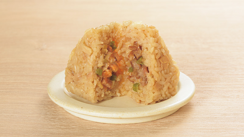 お店の中華そばのスープをイメージして、鶏だし・醤油ラーメンスープ・いりこだしで炊き上げたご飯にメンマを加え、食感も楽しめるおにぎりです。中具にチャーシューとネギを包みました。