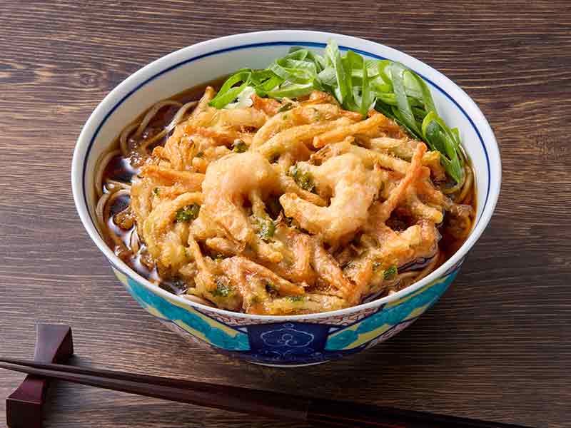 醤油が効いたつゆとぷりっと海老かき揚げが溶け合う温かいおそばです。