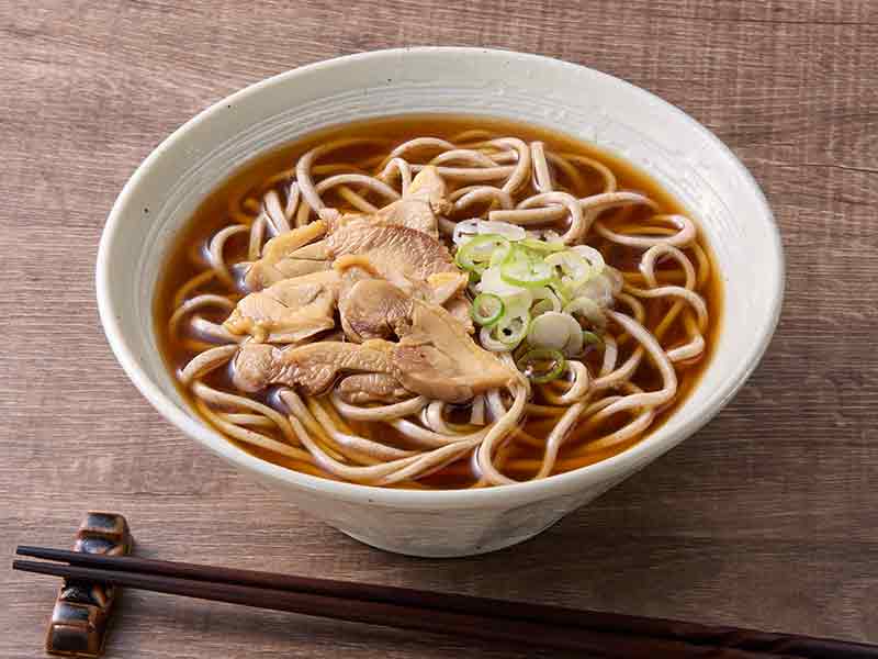 更科特有の角のある太めのそばに出汁の効いたつゆを合わせ、定番のたぬきにダシで煮込んだ鶏もも肉を組み合わせました。