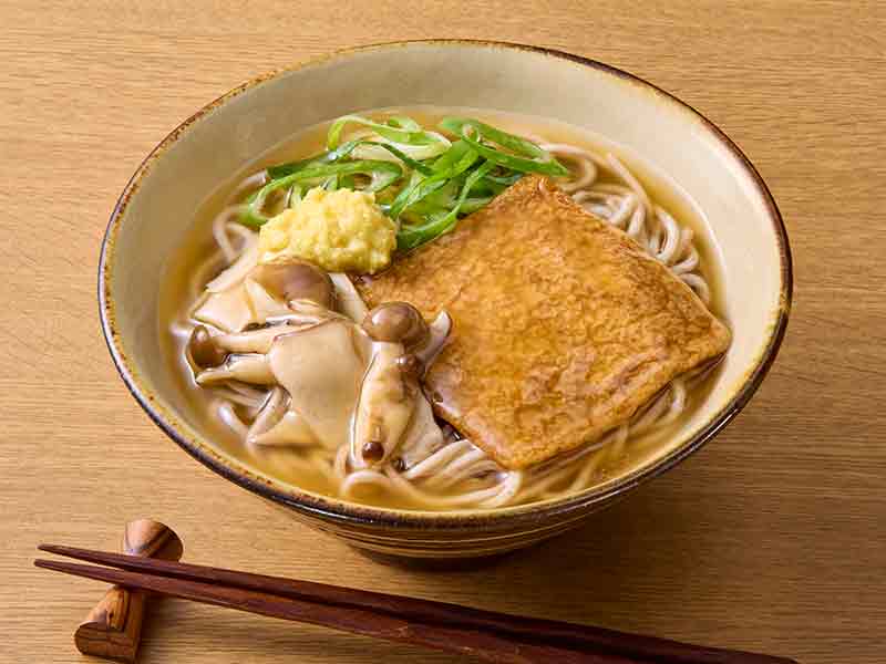 特製出汁にとろみをつけたあんかけそばに甘みのあるお揚げ、きのこ、生姜、ねぎをトッピングしています。