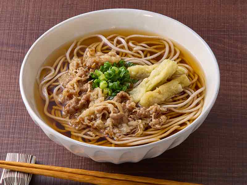 甘辛く味付けした牛肉煮、食感のいいごぼう天、ねぎをトッピングしました。
