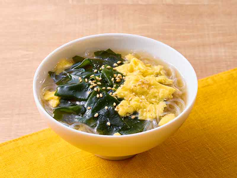食感の良い三陸産わかめに、かきたまと春雨で仕上げたシンプルな和風スープです。