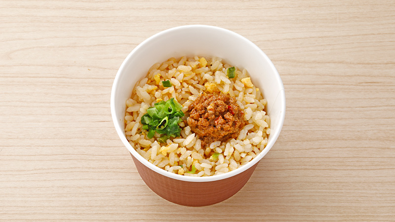 スープ、背脂を配合したラーメンのような奥行きのあるチャーハンに肉みそをトッピングしました。肉みそで味変も楽しめるチャーハンです。