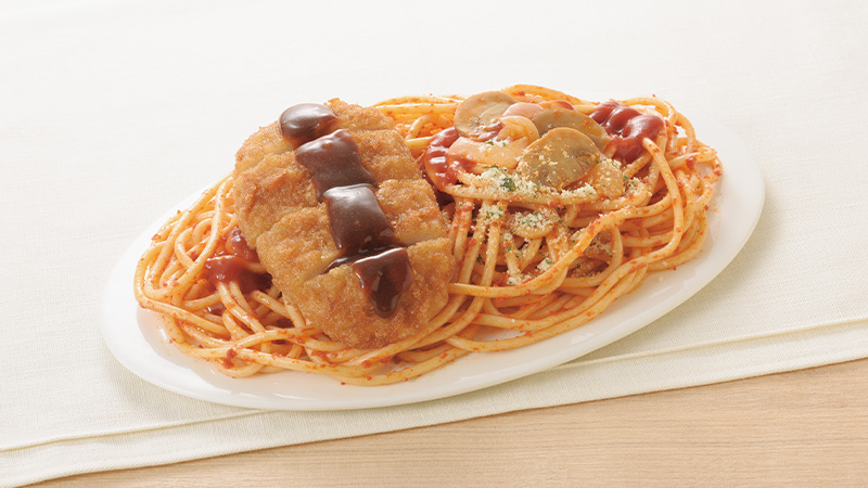 玉ねぎとマッシュルーム、ケチャップの酸味がきいた昔ながらのナポリタンに、とんかつをのせました。
