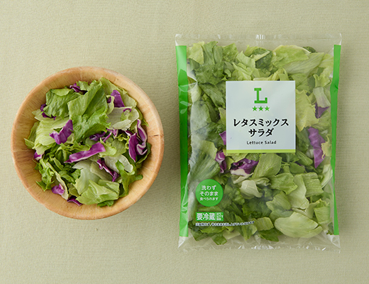 2種のレタス(レタス・グリーンレタス)に、柴キャベツで彩りを加えたカット野菜です。洗わずにそのまま食べられる手軽で便利な商品です。