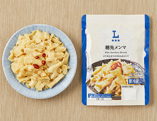 居酒屋等で出現頻度の高いおつまみメニューをセレクト化します。柔らかな食感が特徴の穂先メンマをラー油とごま油でピリ辛味に仕上げました。
