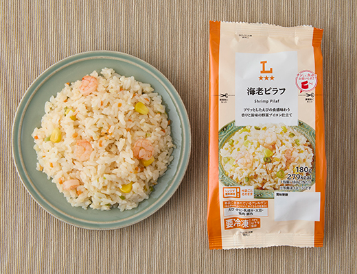 プリッとしたえびの食感とうまみ、野菜ブイヨンの香りを感じるように仕上げました。レンジ後、お皿代わりになる簡単・便利な包材です。