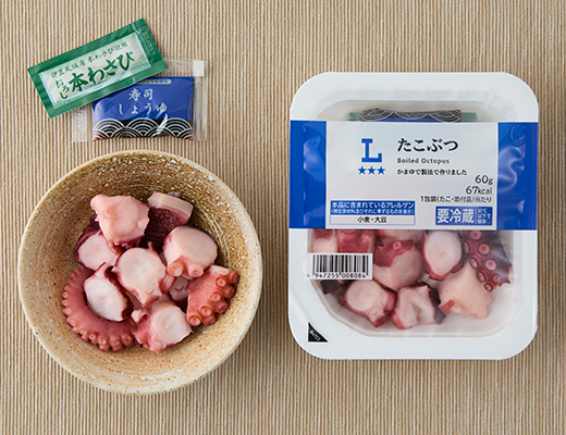 真だこをうまみが逃げない様に丁寧に釜ゆでしました。適度に身が引き締まったゆでだこを食べ易い様にひとくち大にカットしています。醤油・わさび付き。