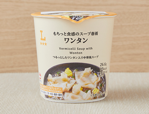 春雨の配合を変えて、もちっとした食感にリニューアルしました。つるっとしたワンタン入り中華風スープです。プラスチック使用量削減を目的に上蓋を紙製に変更しました。