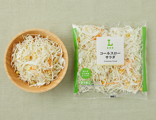 キャベツ・にんじん・コーンの入った、お手軽価格のコールスローサラダです。洗わずにそのままお召し上がりいただけます。