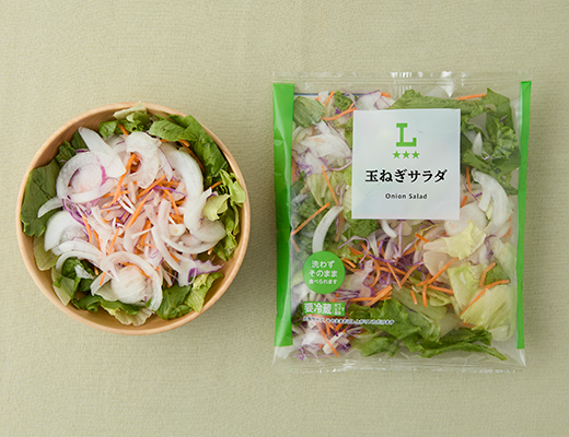 旬の玉ねぎをメインに、レタス・グリーンリーフ・にんじん等で彩りを加えたカット野菜です。洗わずにそのまま食べられる手軽で便利な商品です。