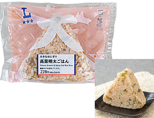 高菜と辛子明太子のピリッと食欲をそそる組み合わせ。食べ応えのある大きなサイズのおにぎり。