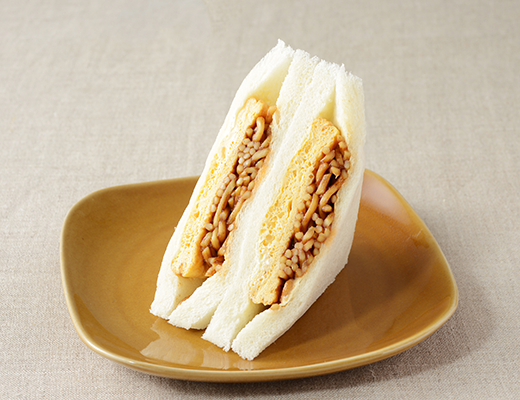 だしをきかせたたまご焼と濃いめに味つけした焼そばをサンドしました。からしマヨネーズがアクセントです。