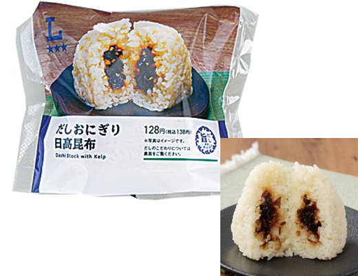 だしの旨みを存分に楽しめるだしおにぎり。相性のよい日高昆布との組み合わせ。