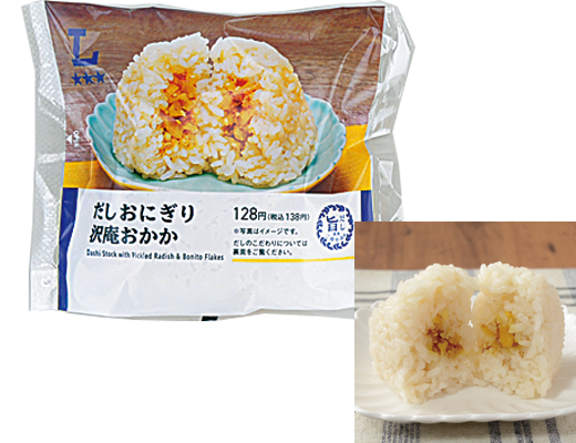 だしの旨みを存分に楽しめるだしおにぎり。食感と風味のある沢庵のおかか和えとの組み合わせ。