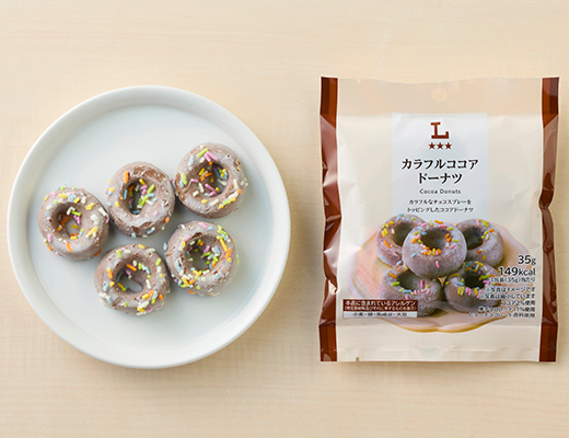 カラフルなチョコスプレーをトッピングしたココアドーナツです。