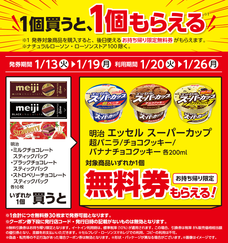 | ●下記対象商品を購入すると、無料クーポンがレシートについてきます。 レシート無料券 発券期間 1/13(火)〜1/19(月) |
