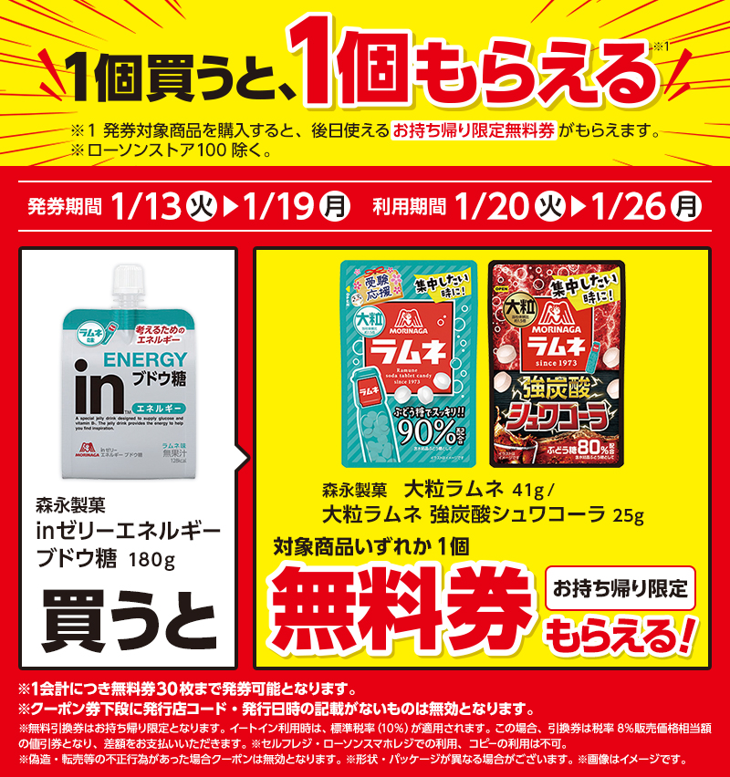 | ●引換券対象商品 レシート無料券 引換期間 1/20(火)〜1/26(月) |