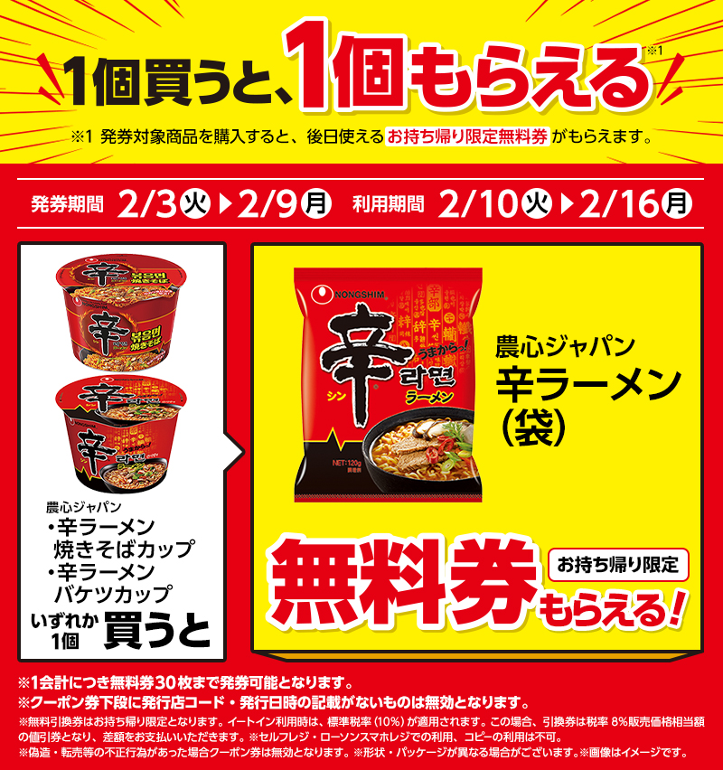 ※袋麺1個もらえるキャンペーンでは、軽減税率対象商品はイートイン利用時、標準税率(10%)が適用されます。この場合、引換券は税率8%での販売価格相当額の値引券となり、差額をお支払いいただきます。