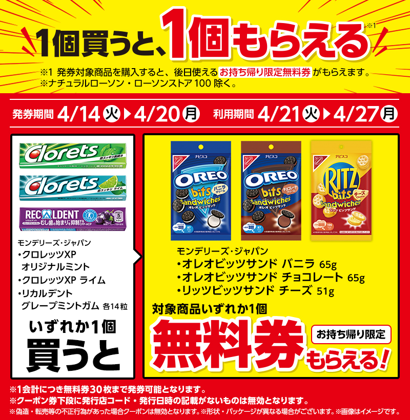 | ●下記対象商品を購入すると、無料クーポンがレシートについてきます。 レシート無料券 発券期間 4/14(火)〜4/20(月) |