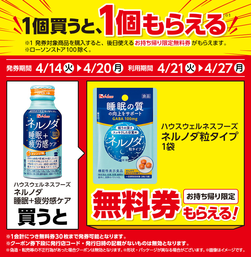 | ●下記対象商品を購入すると、無料クーポンがレシートについてきます。 レシート無料券 発券期間 4/14(火)〜4/20(月) |