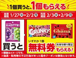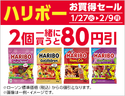 対象のお菓子を2個同時購入で100円引、3個同時購入で200円引