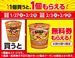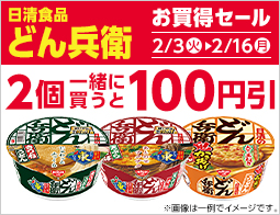 対象の即席食品を2個同時購入で100円引、3個同時購入で200円引