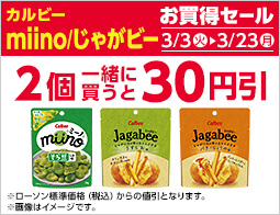 対象のお菓子を2個同時購入で30円引、3個同時購入で60円引