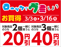 対象のお菓子を2個同時購入で20円引、3個同時購入で40円引