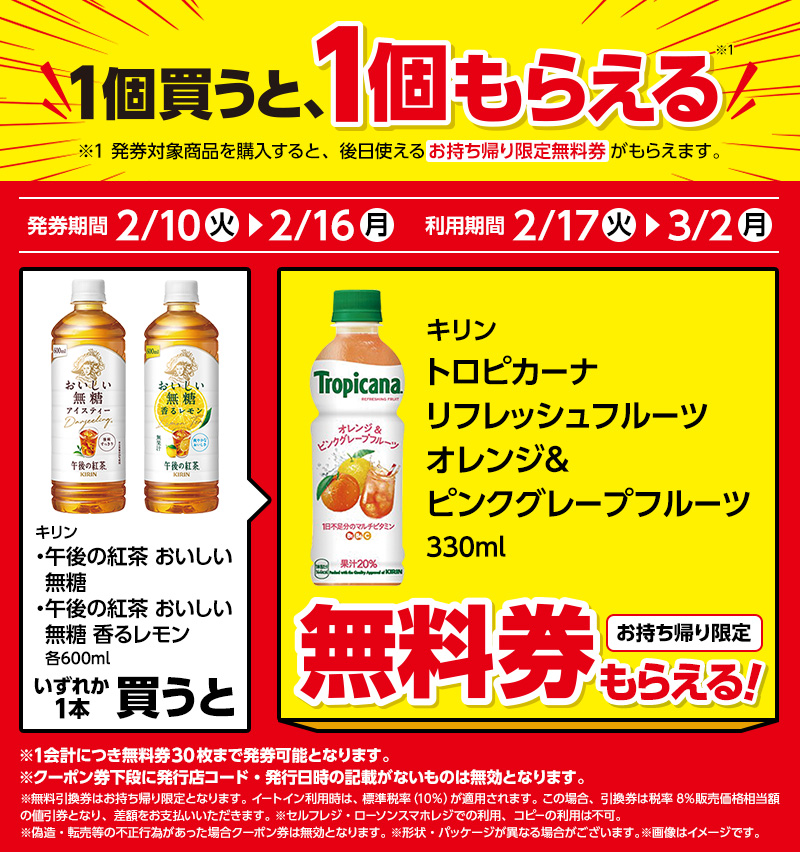 | ●下記対象商品を購入すると、無料クーポンがレシートについてきます。 レシート無料券 発券期間 2/10(火)〜2/16(月) |